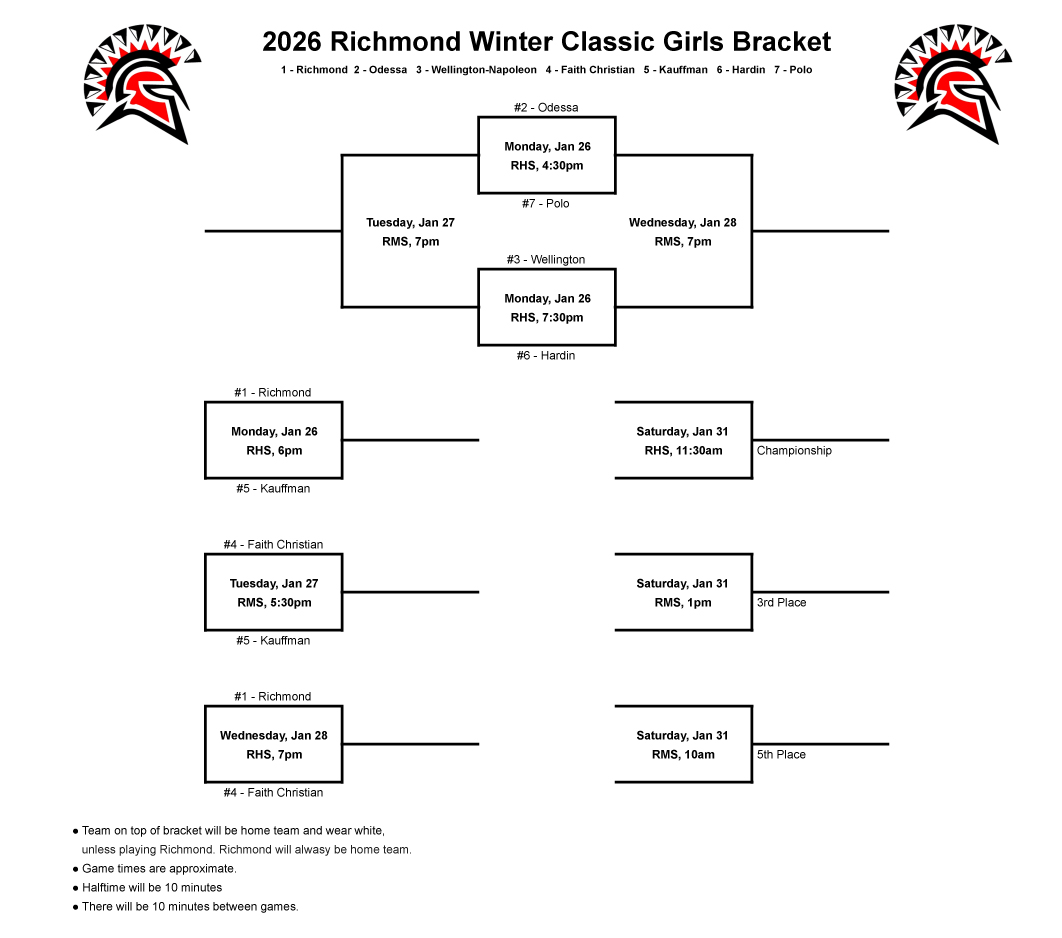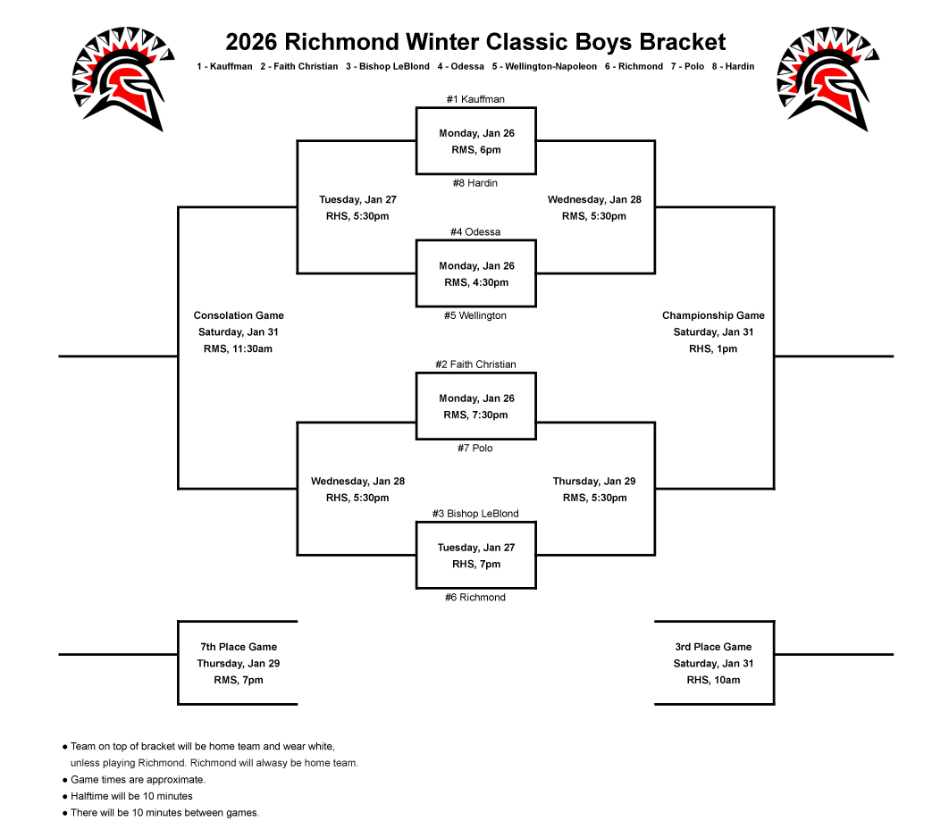 RICHMOND, M0- The 2026 Richmond Winter Classic will be held at the Richmond High School and Middle School gymnasiums Jan. 26-31. This years field includes teams from Richmond, Odessa, Wellington-Napoleon, Faith Christian Academy, Hardin-Central, Polo, Bishop LeBlond of St. Joseph and Ewing Marion Kauffman Academy. See the brackets below.