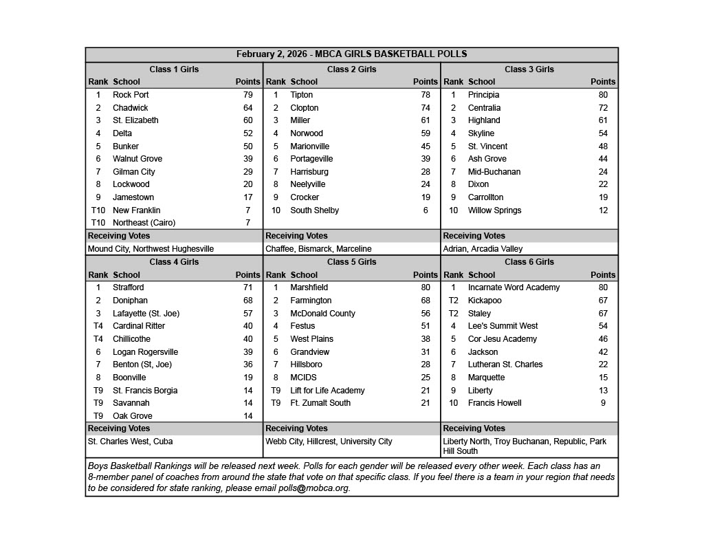 CARROLLTON, Mo- The latest girls poll from the Missouri Basketball Coaches Association was released this morning. Several area teams recieved votes or are ranked. See the list by class below.